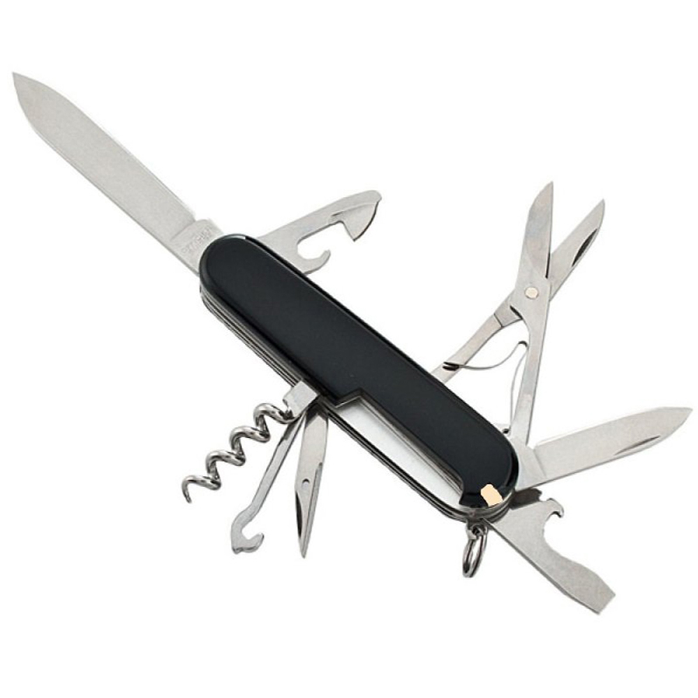 Scyzoryk w kolorze czarnym z dużą ilości narzędzi w standardowych wymiarach, długość 91 mm.
