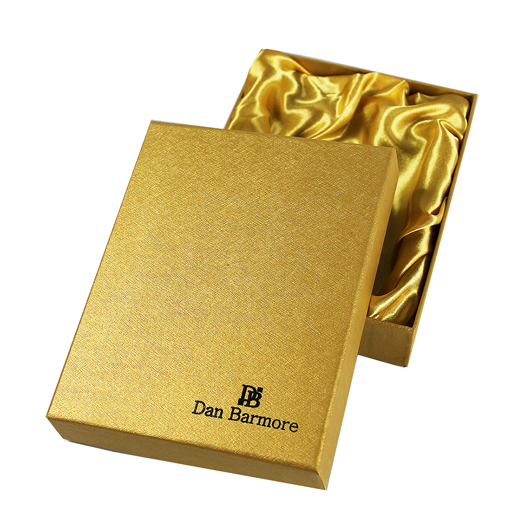 Zapakowana w eleganckie pudełko kartonowe z atłasową wyściółką w kolorze złotym.