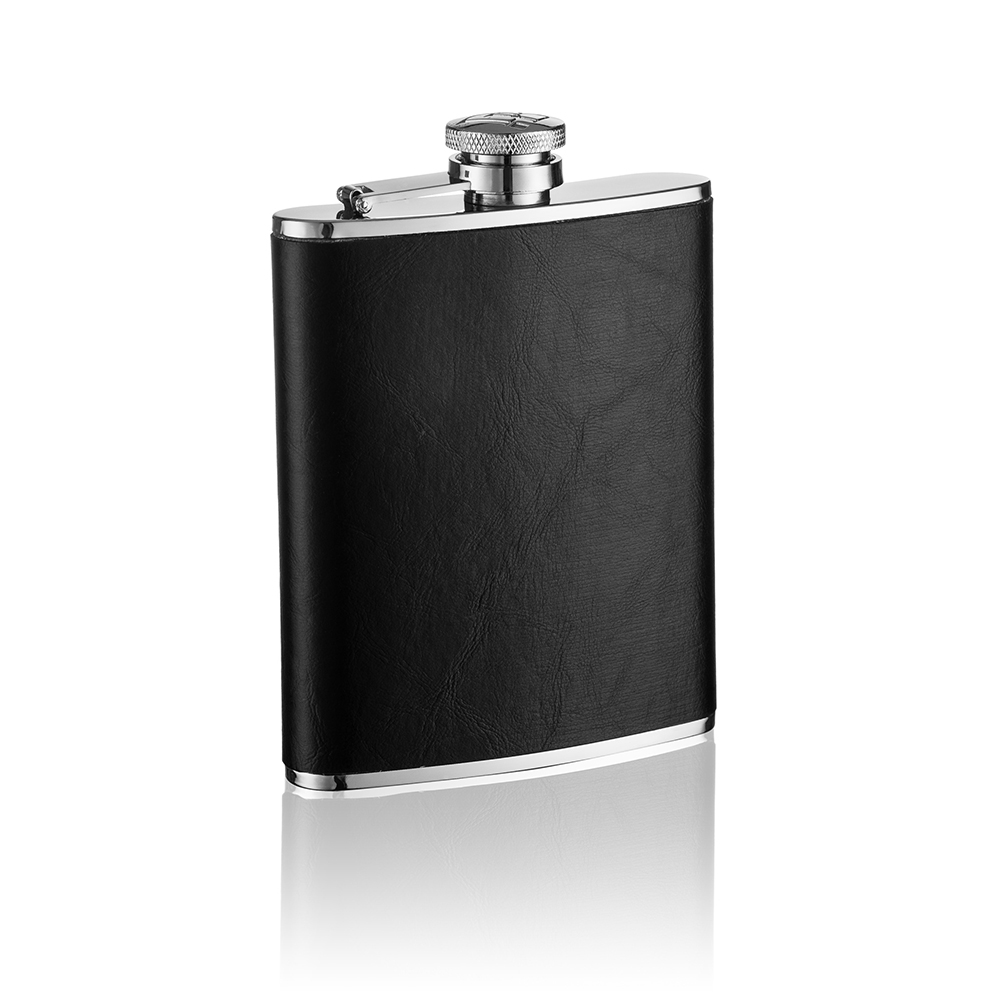 Piersiówka stalowa o pojemności 180 ml, z rantem ozdobiona ekoskórą w kolorze czarnym z możliwością graweru dedykacji.