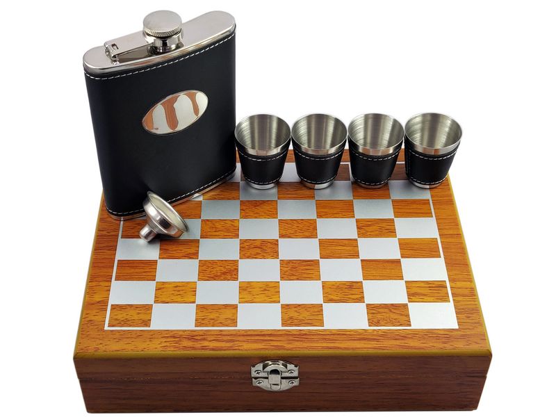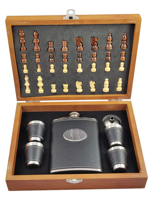 Upominkowy zestaw prezentowy z piersiówą, kieliszkami i szachami.