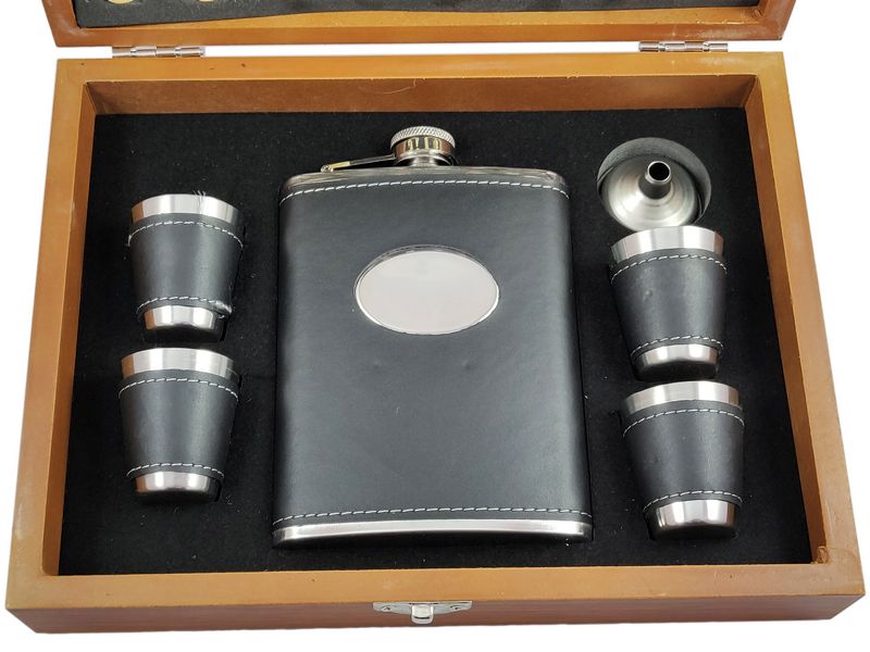 Zestaw składa się z piersiówki wykończonej czarną ekoskórą, czterech kieliszków i lejka.
