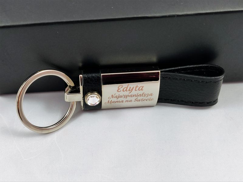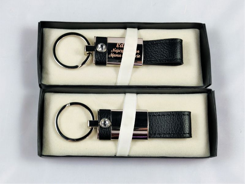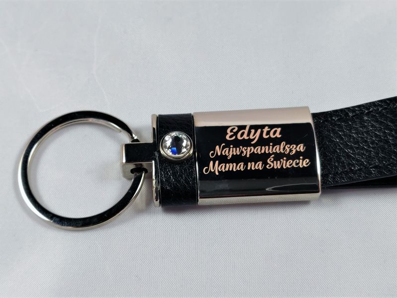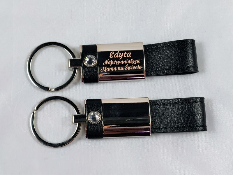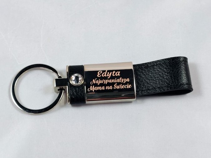 Na breloczku istnieje możliwość dwustronnego graweru na skórzanym pasku lub metalowej obejmie.