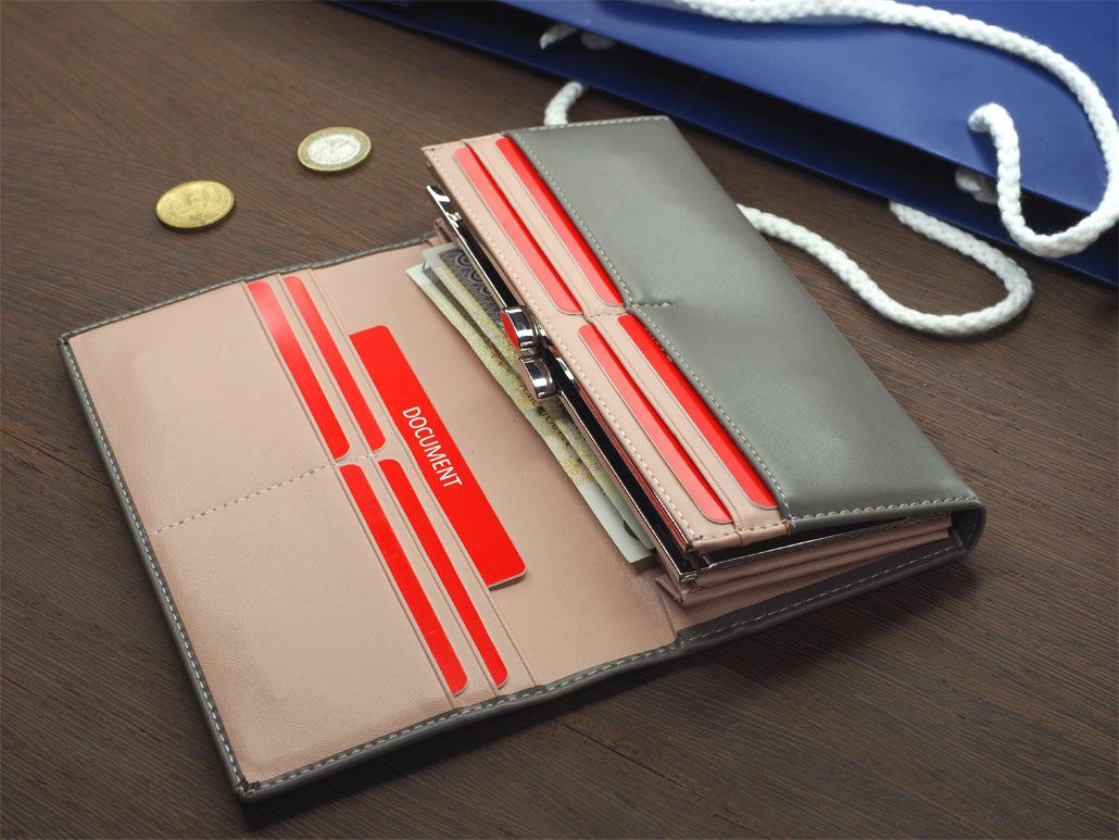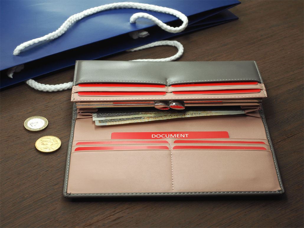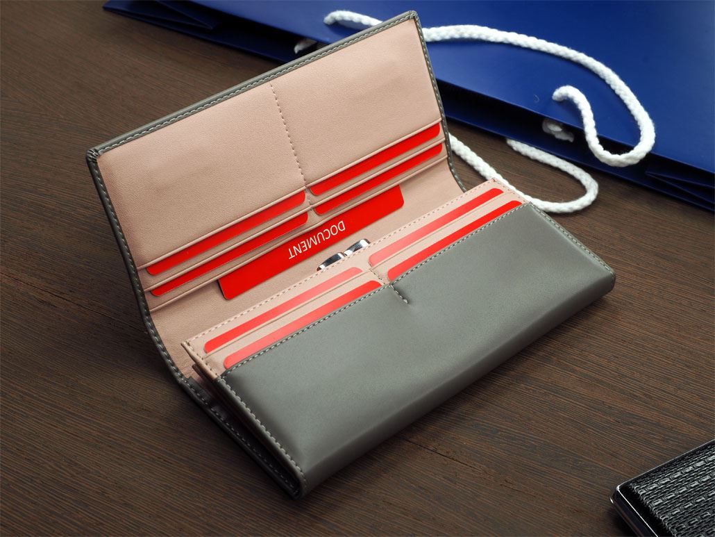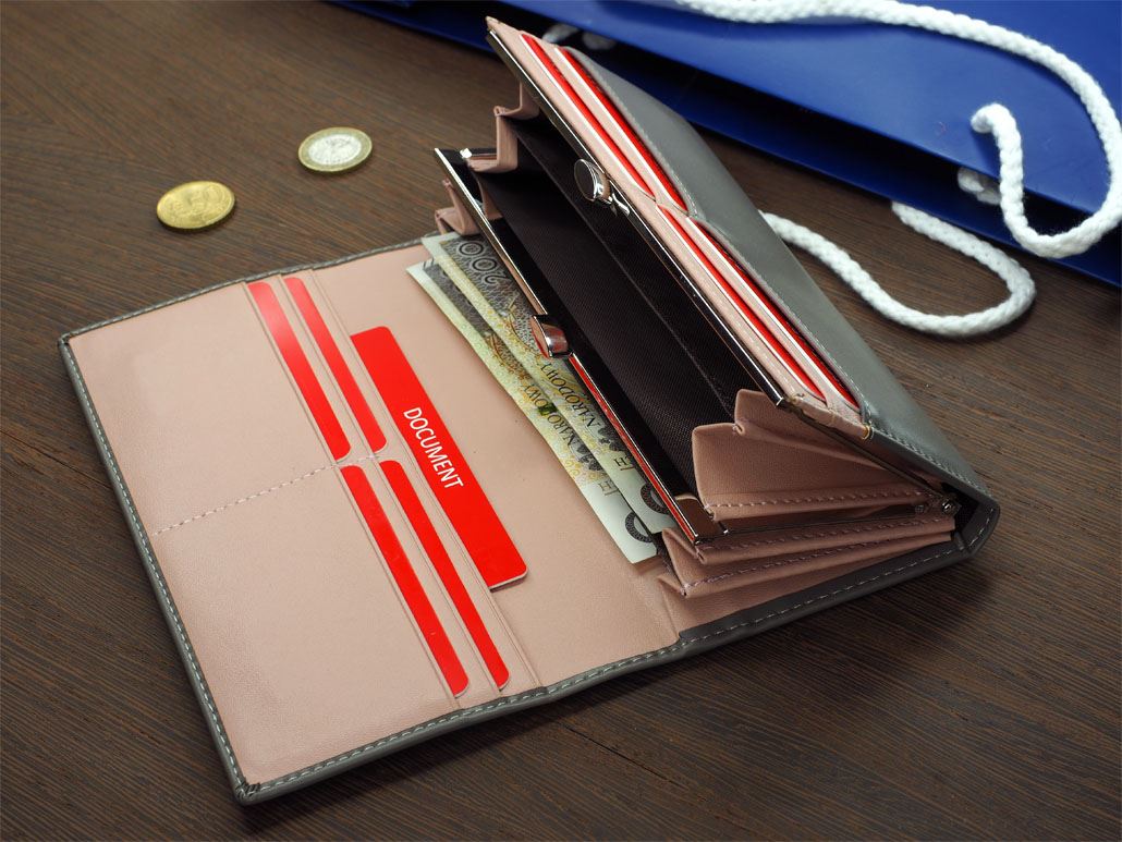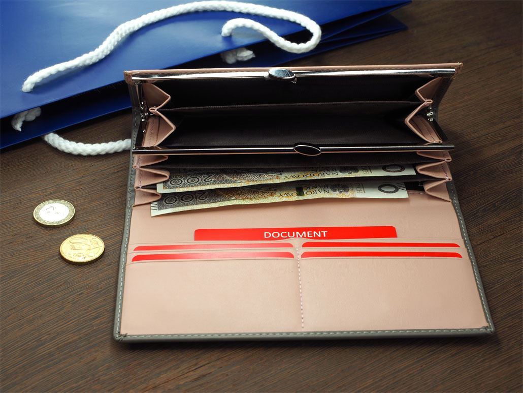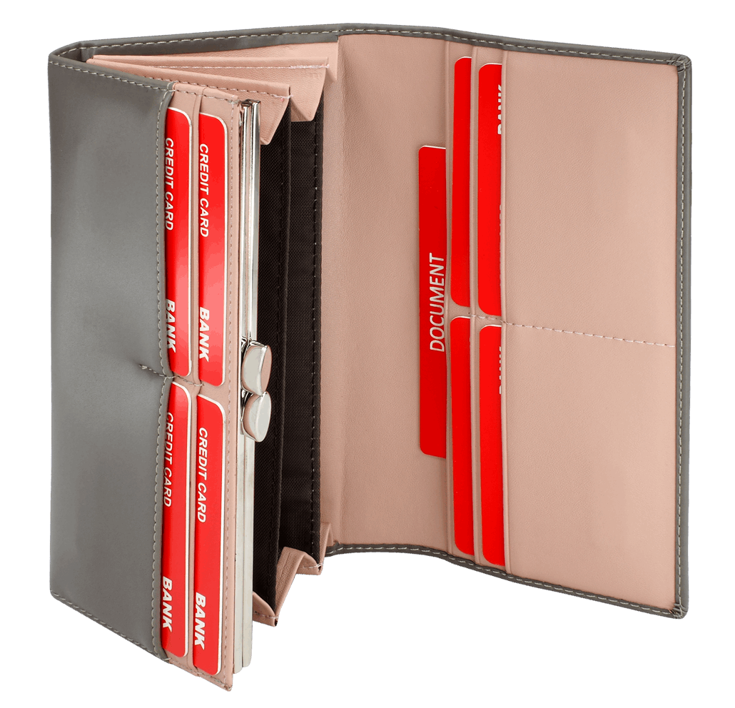 Portfel damski z wszystkimi podstawowymi funkcjami i kieszeniami na bilon, banknoty, karty, zdjęcia i dokumenty.