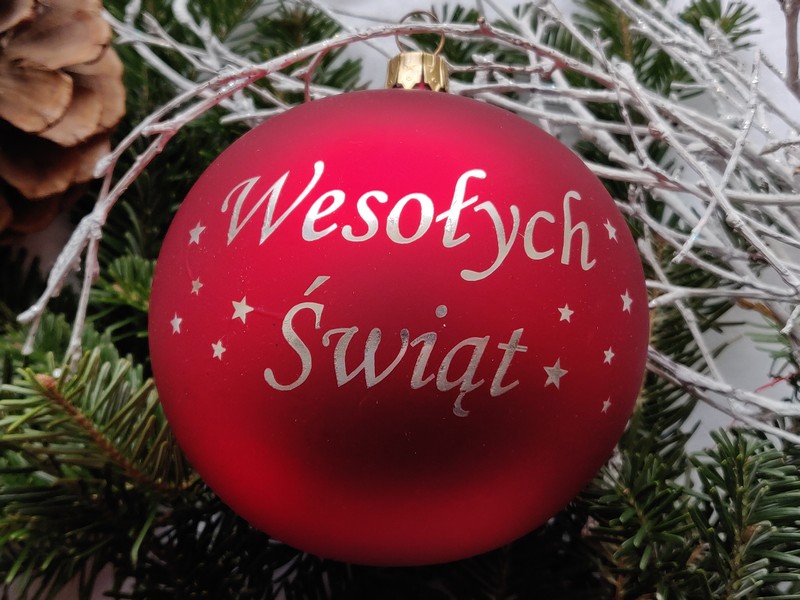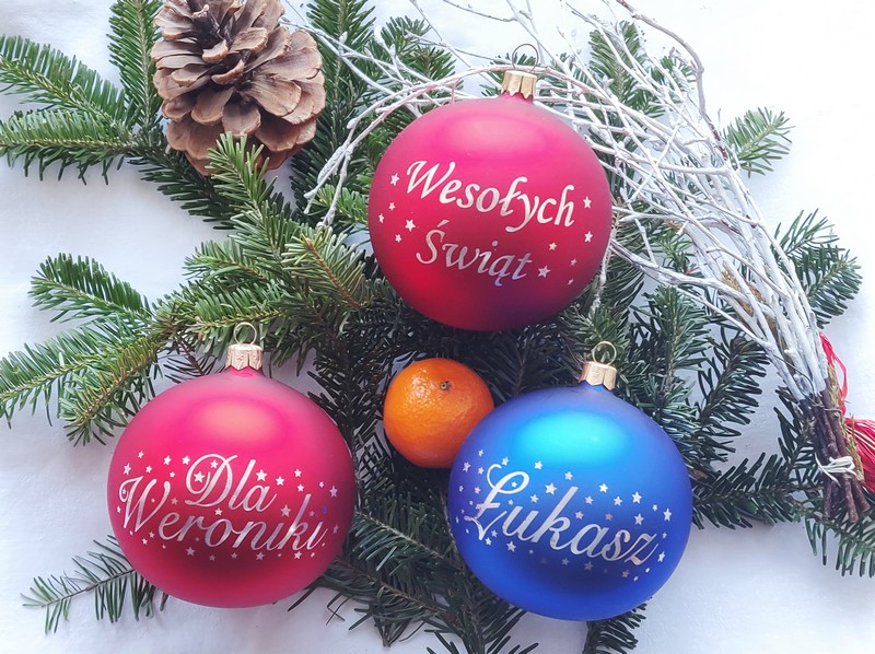 Świąteczna szklana bombka choinkowa z grawerem indywidualnej dedykacji.