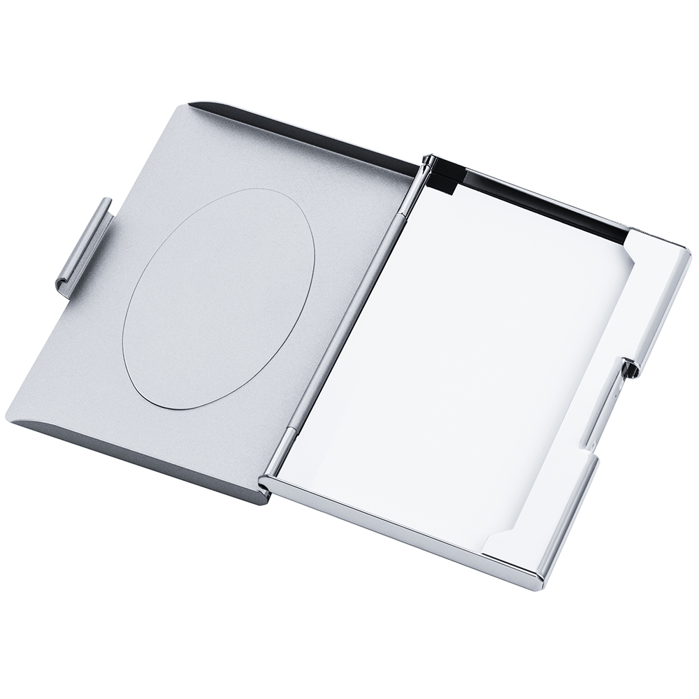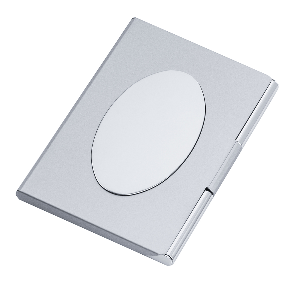 Elegancki metalowy wizytownik marki Dan Barmore z owalnym emblematem (idealnym pod grawer).